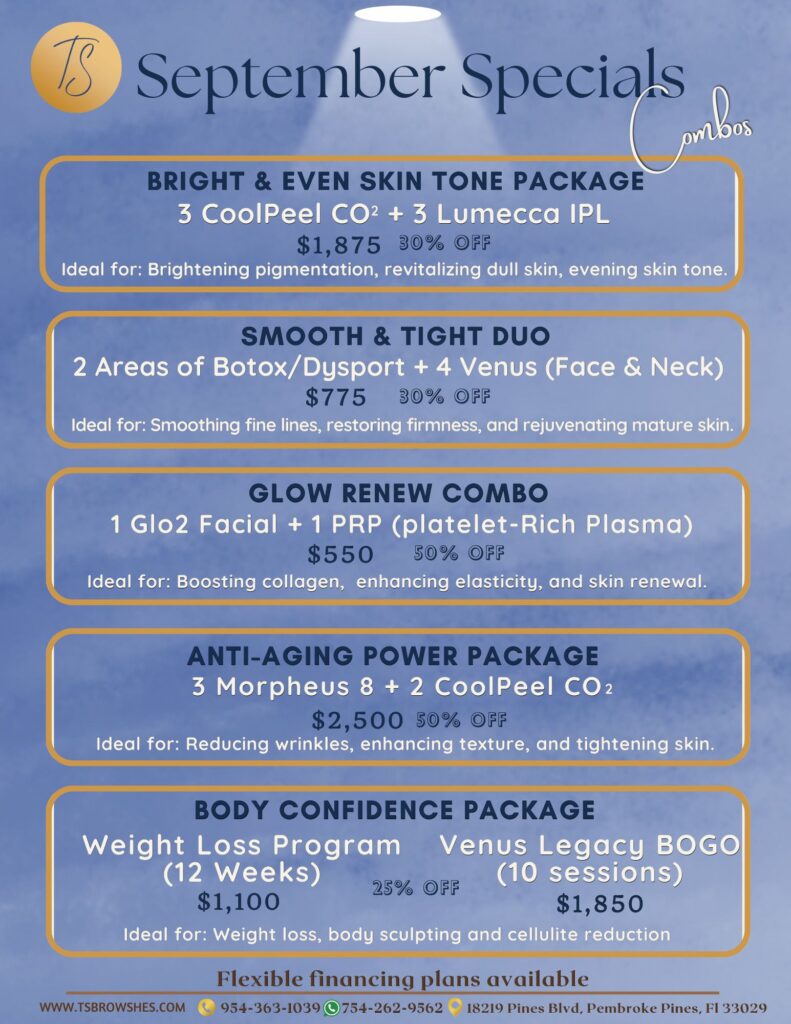 If you’re looking for a high-quality medspa in Pembroke Pines, FL, look no further than TS Browshes Esthetics & Laser. We are certified experts in the esthetic industry, offering a wide range of services tailored to your needs. Whether you’re seeking Medical Weight Loss, Permanent Make Up, Body Sculpting, Venus Legacy, Morpheus 8, or Laser Hair Removal, we’re ready to provide you with the best services and results.